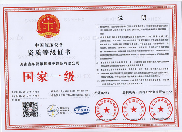 液壓設備資質證書(國家一級)